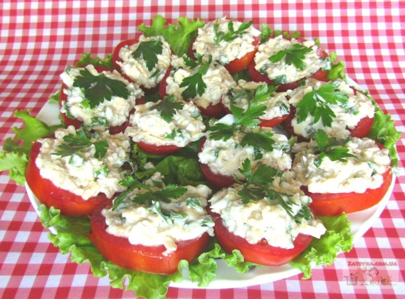 На блюдо выложить листья салата, сверху помидоры, на помидоры начинку из печени трески. Сверху по желанию украсить петрушкой и подавать к столу. Закуска с помидорами и печенью трески готова! Более подробный процесс приготовления смотрите на видео. Приятного аппетита!