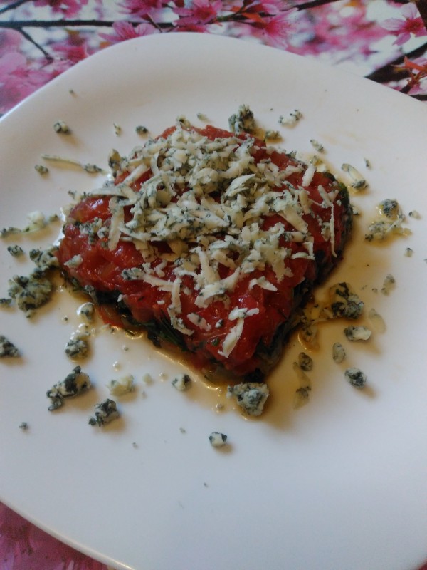 Понадобятся: баклажаны, помидоры, лук, брынза, чеснок, зелень, соль, перец по вкусу. Снять с баклажанов кожицу овощечисткой, удалить семена, порезать маленькими кубиками, обжарить. Помидоры обдать кипятком, потом холодной водой, снять кожицу, после чего разрезать их на четыре части и ложечкой удалить из помидор сок с семенами. Оставшуюся мякоть порезать и обжарить. Лук также порезать и обжарить. Все овощи остужаем и складываем слоями друг на друга, делая прослойки из измельченного чеснока с зеленью — сначала баклажаны, затем лук, помидоры, слегка утрамбовывая слои. Даем салату немного постоять в холодильнике.