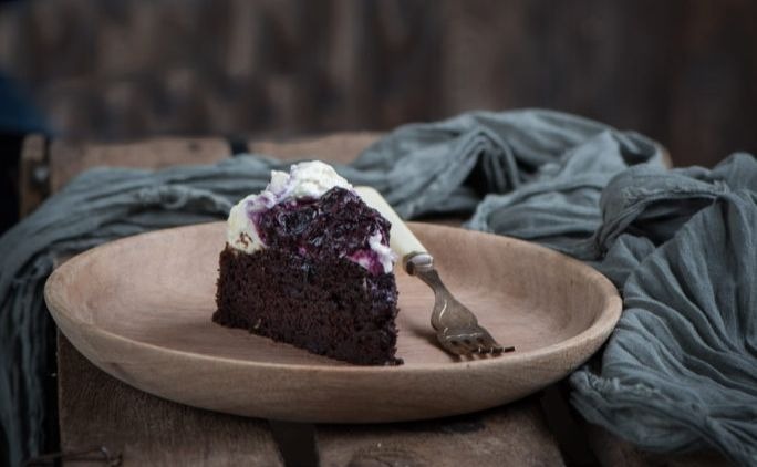 Понадобится: 300 г свеклы, 3 яйца, 1/4 стакана оливкового масла, 50 гр. сливочного масла, 2 стакана миндальной муки,100 гр. какао-порошка, 100 гр крахмала,100 гр. сах. песка, разрыхлитель, 1 чайная ложка яблочного уксуса; для начинки — 300 гр. черники, сахар и желатин; для крема: 300 г сливочного сыра «Филадельфия», 1 столовая ложка меда, цедра 1 лимона.