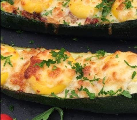 Понадобится: небольшие кабачки, ветчина или бекон, лук, яйца, зелень.