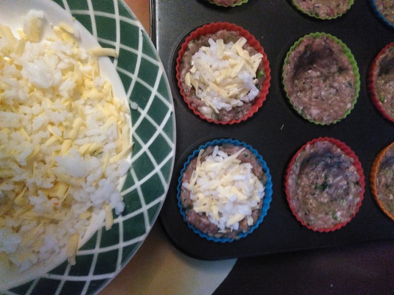 Фарш распределяем по корзиночкам для кексов — тонким слоем по стенкам и дну, в середину выкладываем рис, смешанный с сыром.