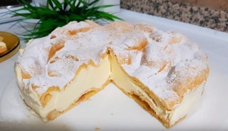 На два коржа: 100 г муки, 120 г воды, 70 г сливочного масла, 3 яйца, соль, 3-4 г разрыхлителя; для крема: 500 мл молока, 130 г сахара, 10 г ванильного сахара 40 г крахмала, 2 яйца, 180 г сливочного масла.