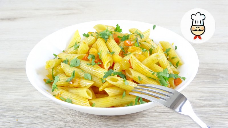 При подаче посыпаем зеленью. Вкусные макароны с яблоком готовы. Приятного аппетита.