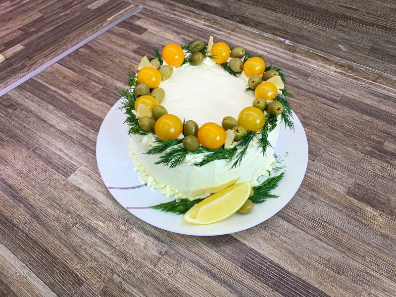 После того как торт отстоялся, снять кольцо и обмазать торт кремом, крем разровнять и можно украшать. Украсить можно по вашему усмотрению. Я оформила веточками укропа, помидорами черри и маслинами. Получилось довольно неплохо)