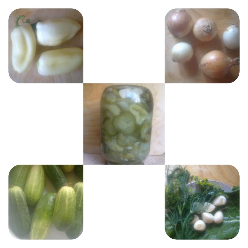 Понадобится: огурцы, сладкий перец, лук, специи. На пятилитровую кастрюлю делаем рассол: 2 ст.л. соли, 1 ст.л. сахара, раст.масло 50гр, уксус по вкусу. Огурцы нарезаем кружочками, лук и перец кольцами (можно произвольно). У меня были маленькие головки сладкого лука — я добавила их туда же.